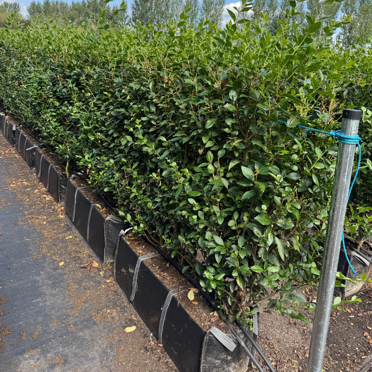 While colder regions or poor soils may cause Ligustrum ovalifolium to lose some or all of its leaves during winter, it remains resilient and continues to provide reliable coverage. If left to grow naturally, it produces white flowers and black berries, although regular trimming typically prevents this. To maintain a neat, dense hedge, it’s recommended to trim at least three times per year, shaping it with a slightly narrower top to ensure it stays leafy from top to bottom.